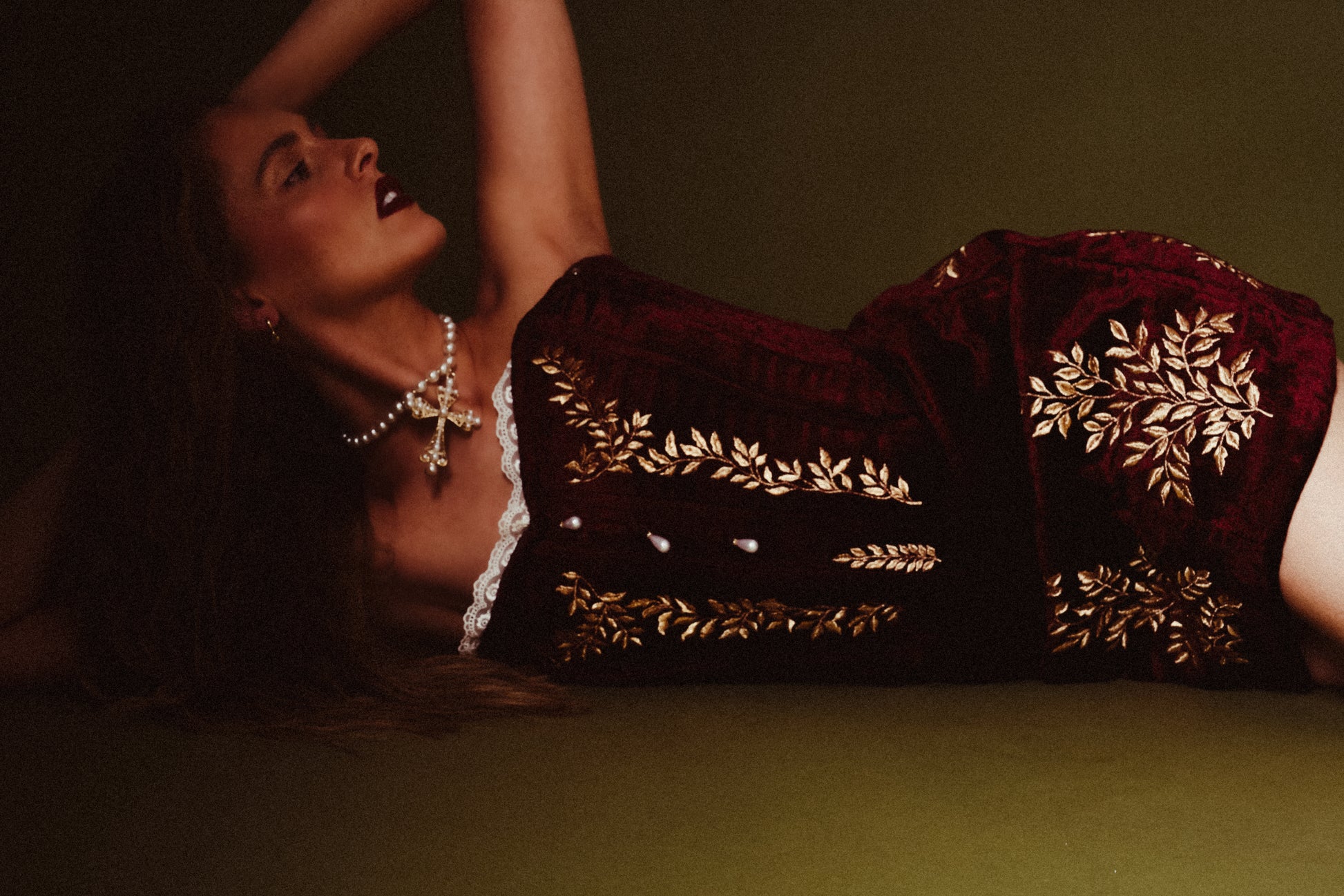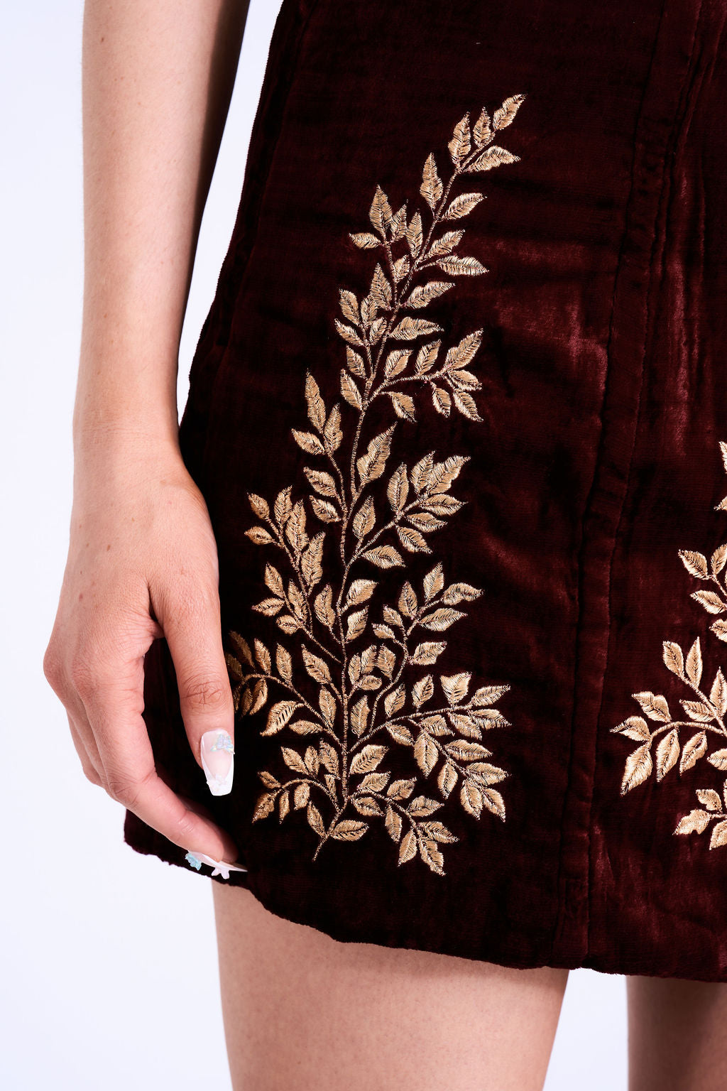 The Empress Miniskirt is a regal, handcrafted piece birthed to embody strength, sensuality, and sacred elegance. Cut from rich oxblood velvet, this structured mini skirt features intricate gold leaf embroidery, hand-stitched with devotion and intention.