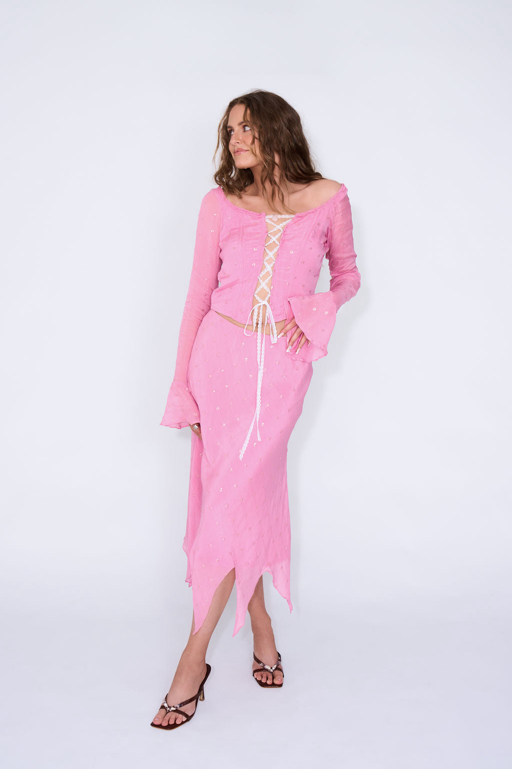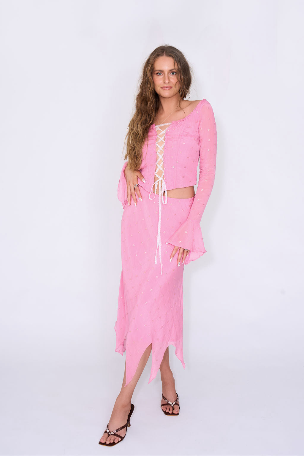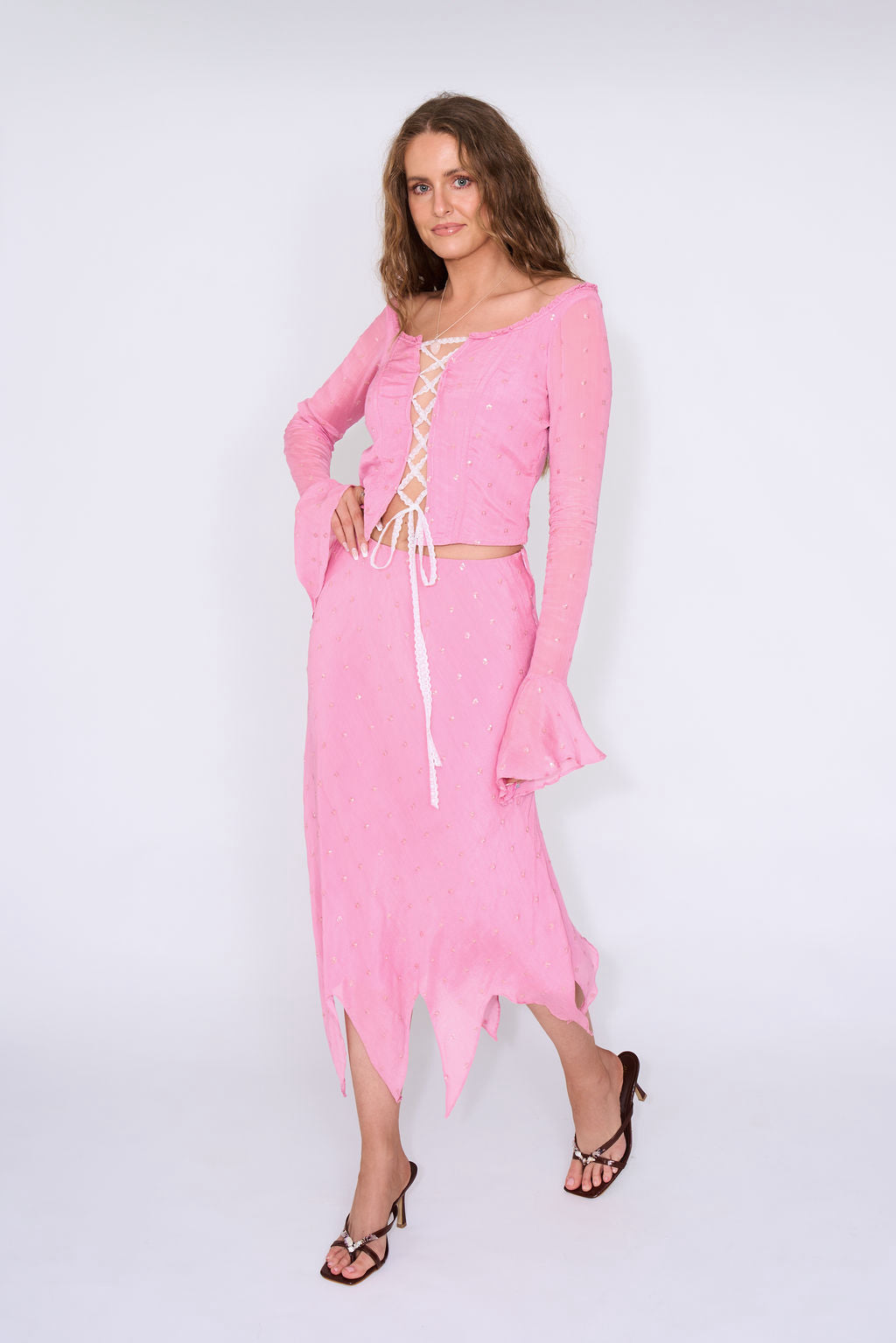 Crafted in a cool-toned petal pink viscose and scattered with individually sewn silver sequins, the Fae Top drapes fluidly on the body with a gently shaped silhouette. The bodice is softly structured to flatter the waist while remaining light and comfortable, finished with a decorative lace-up front designed to sit with an intentional open gap that reveals a hint of skin.
